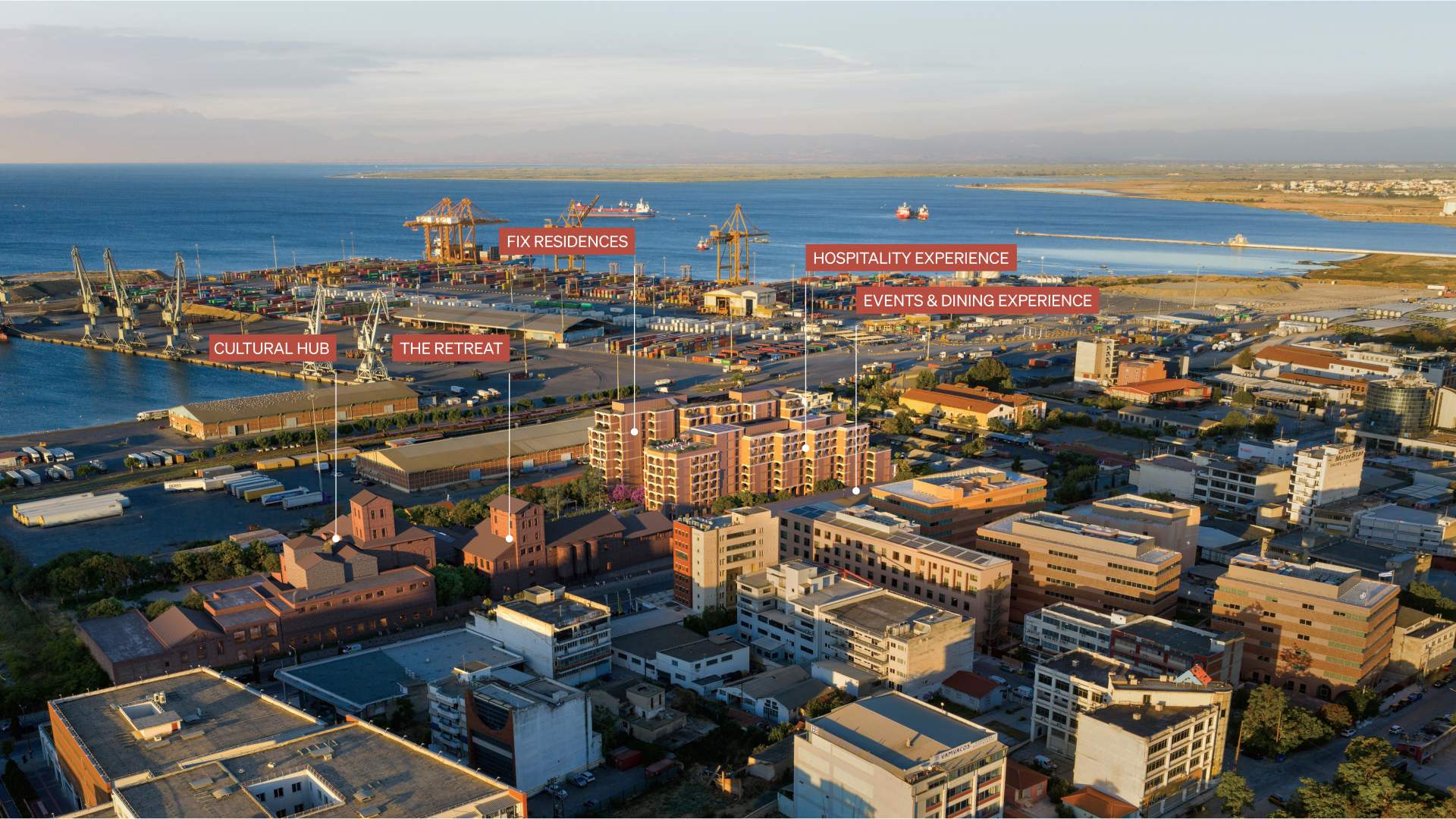 Next to the residential building, a five-star, high-standard hotel is planned, offering a fully integrated hospitality experience with panoramic views of the sea, the historic buildings within the complex, and HUB 26, the first sustainable business park in Northern Greece. The architectural design is being developed by Foster + Partners, and the hotel is targeting LEED Gold certification.